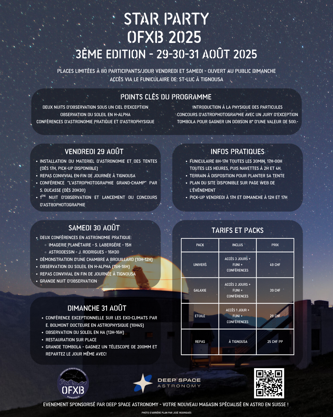 L'Observatoire François-Xavier Bagnoud (OFXB) a accueilli avec succès la Star Party 2024, un événement incontournable pour les passionnés d'astronomie et d'astrophotographie, qui s'est tenu du vendredi 30 août au dimanche 1er septembre 2024 à Saint-Luc, en Valais.